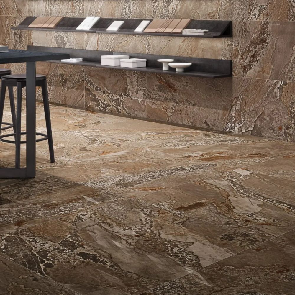 Planet Oxid Metal Shine de la Fanal combină dramatismul metalului oxidat cu eleganța unui finisaj lucios, creând o gresie porțelanată cu un puternic efect vizual. Tonurile bogate de rugină, brun închis și accente metalice redau perfect textura industrială a metalului expus trecerii timpului, într-o interpretare sofisticată și contemporană.