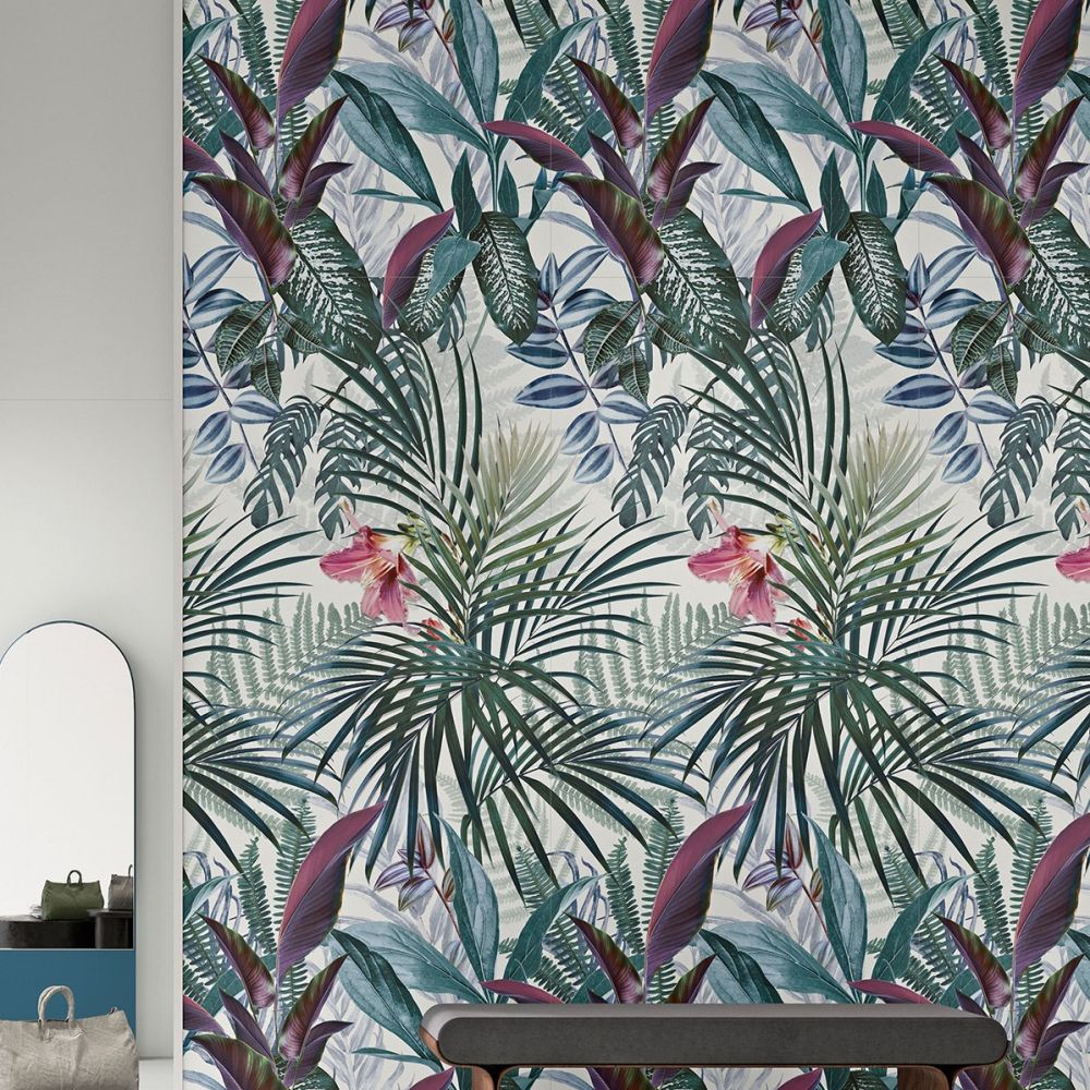 Această mostră prezintă un model luxuriant de vegetație tropicală, caracterizat de o combinație bogată de frunze de palmier, ferigi și flori roz vibrante pe un fundal alb luminos. Designul încorporează nuanțe profunde de verde smarald, turcoaz estompat și accente de vișiniu-purpuriu, aducând vitalitate și un aer exotic oricărui spațiu. Potrivit pentru a transforma un perete într-o declarație de stil, acest decor oferă o senzație de prospețime și adâncime vizuală.